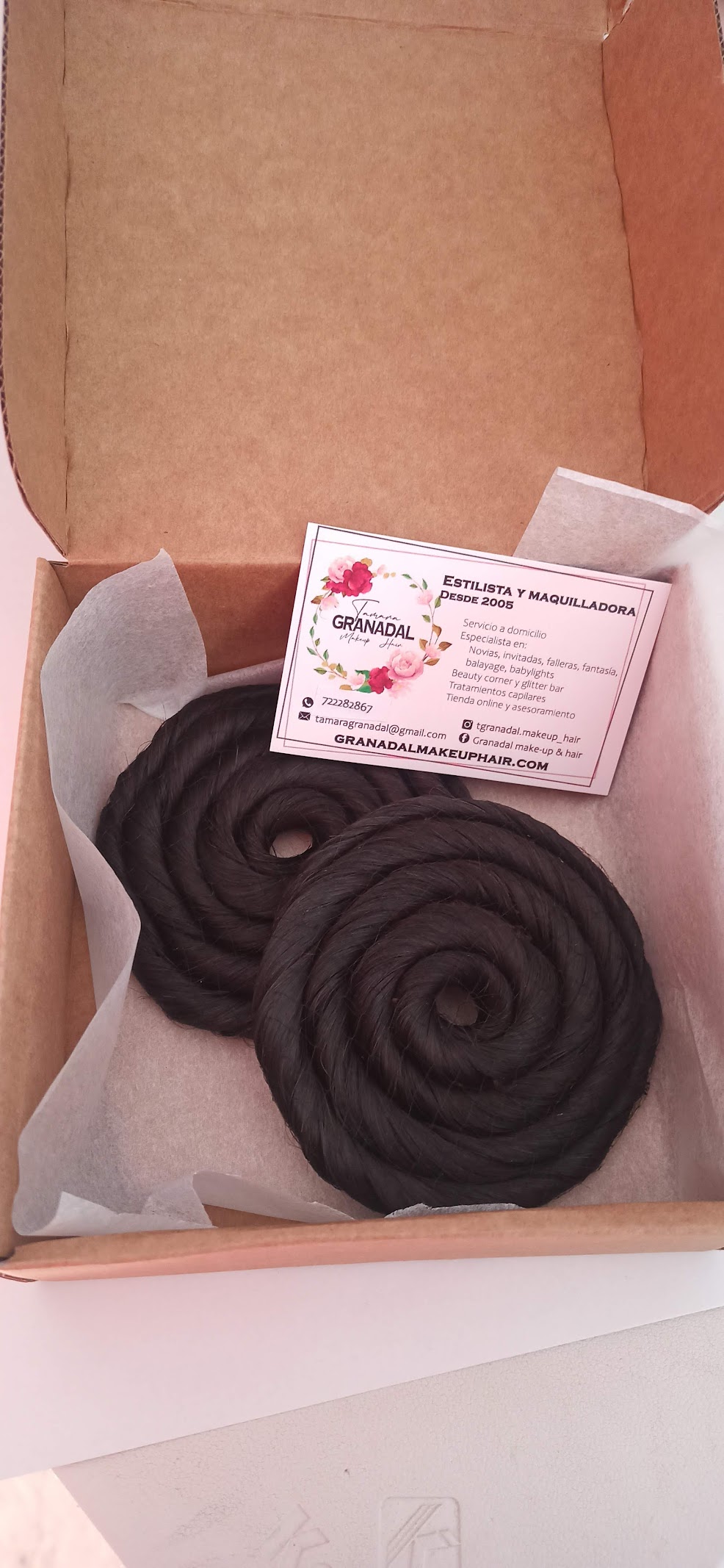 *Para saber qué tipo de rodete necesitas puedes concertar visita o recortar un círculo del tamaño que crees que necesitas y probarlo, teniendo en cuenta que el centro de este debe quedar justo en la patilla o un dedo más hacia arriba y hacia atrás (donde haya pelo donde fijarse).